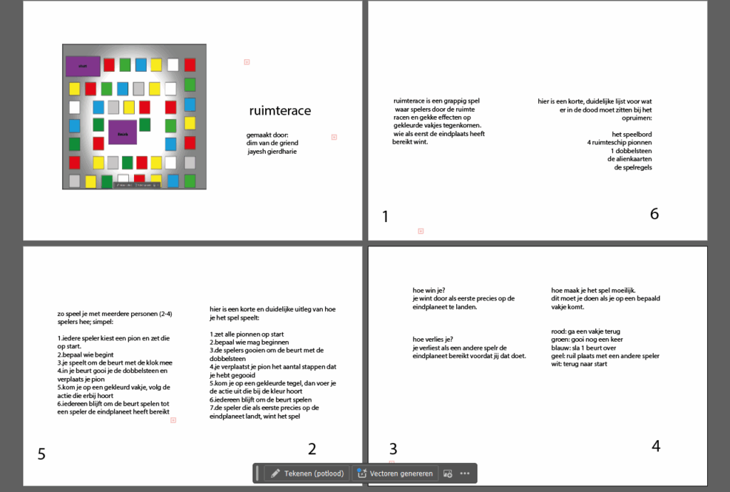 Tijdens de lessen moesten wij een bordspel maken en gebruikten daarbij de app adobe. Eerst kregen we een een uitleg hoe de opdracht in elkaar zat en hoe de website werkte. Vervolgens gingen ik en mijn klasgenoot waarmee ik samenwerkte (Jayesh) brainstormen over wat we wouden maken en welk onderwerp het moest hebben. Uit eindelijk zijn we op het thema ruimte gekomen en we hebben ons bordspel toen ruimterace te noemen. Daarna moesten we regels verzinnen bijvoorbeeld dat je als je op het blauwe vakje komt dat je opnieuw mag gooien of als je op het rooie vakje komt dat je een vakje terug moet. Toen wij klaar waren gingen we het bordspel spelen maar verliep het niet heel soepel we hadden iets teveel vakjes neergezet waardoor het moeilijk was om ver te komen maar daar leer je natuurlijk van voor ons was het ook de eerste keer en volgende keer doen we het beter.